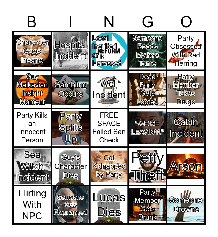 This bingo card has 22 images, a free space and 24 words: Guy's Character Dies, Someone Gets Frognapped, Well Incident, Flirting With NPC, Party Obsessed With Red Herring, Character Goes Insane, Guy Malkavian Insight Moment, Hospital Incident, "WE'RE LEAVING!", Cat Kidnapped by Party, Dead Body Gets Looted, Party Kills an Innocent Person, Petty Theft, Arson, Gambling Occurs, Party Member Gets Drunk, Cabin Incident, Local Insulted or Harassed, Patry Member Takes Drugs, Party Splits Up, Someone Drowns, Sea Witch Incident, Someone Reads Mythos Tome and Lucas Dies.