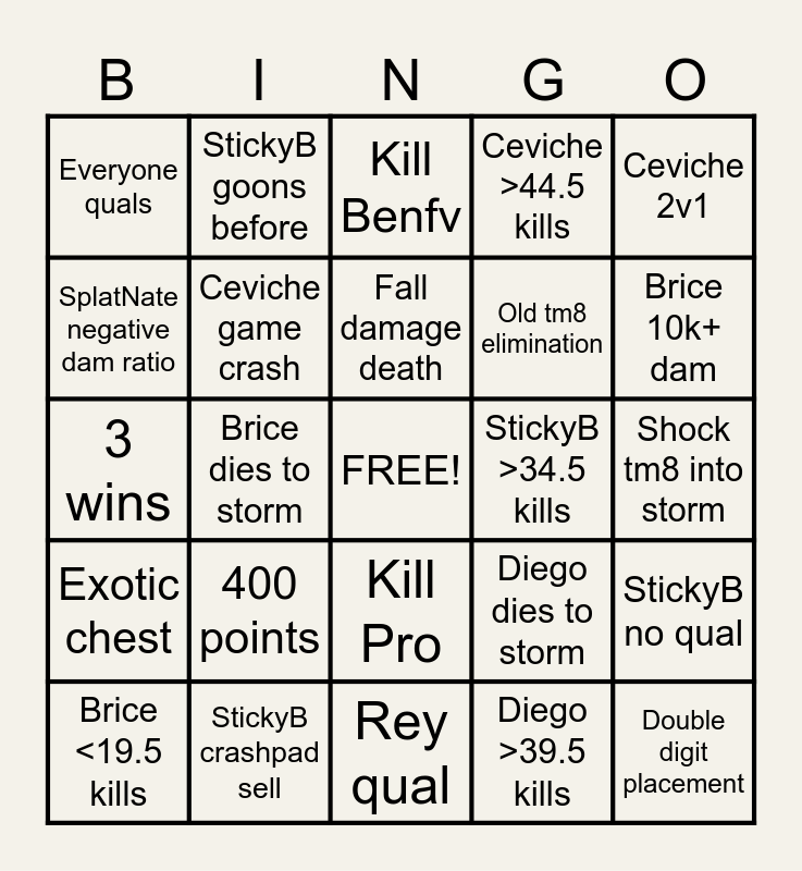 This bingo card has a free space and 24 words: 400 points, StickyB crashpad sell, Fall damage death, Brice <19.5 kills, Ceviche 2v1, Everyone quals, SplatNate negative dam ratio, StickyB goons before, StickyB >34.5 kills, Kill Pro, Old tm8 elimination, 3 wins, Diego dies to storm, StickyB no qual, Ceviche game crash, Diego >39.5 kills, Shock tm8 into storm, Kill Benfv, Brice 10k+ dam, Brice dies to storm, Double digit placement, Exotic chest, Ceviche >44.5 kills and Rey qual.