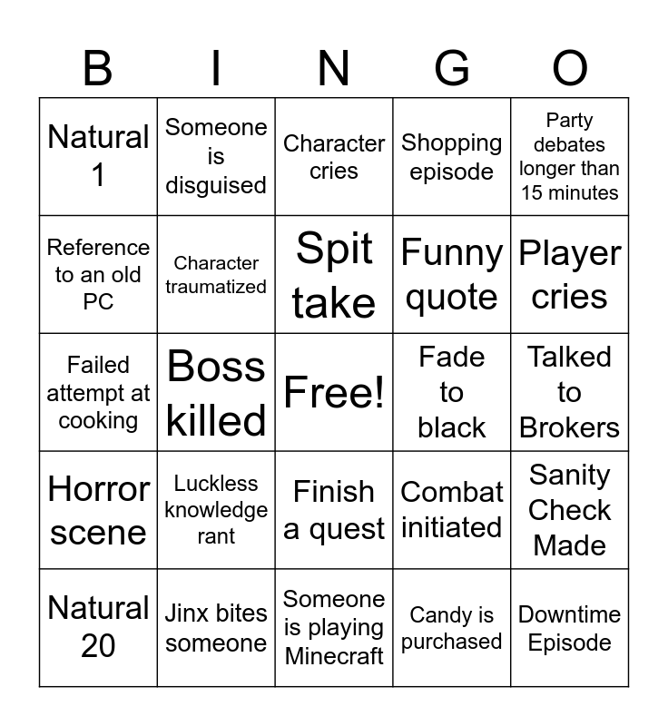 This bingo card has a free space and 24 words: Luckless knowledge rant, Jinx bites someone, Spit take, Natural 20, Party debates longer than 15 minutes, Natural 1, Reference to an old PC, Someone is disguised, Fade to black, Finish a quest, Funny quote, Failed attempt at cooking, Combat initiated, Sanity Check Made, Character traumatized, Candy is purchased, Talked to Brokers, Character cries, Player cries, Boss killed, Downtime Episode, Horror scene, Shopping episode and Someone is playing Minecraft.