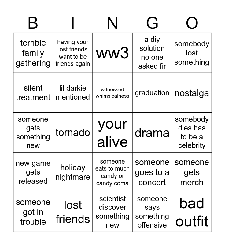 This bingo card has a free space and 24 words: holiday nightmare, lost friends, witnessed whimsicalness, someone got in trouble, somebody lost something, terrible family gathering, silent treatment, having your lost friends want to be friends again, drama, someone eats to much candy or candy coma, graduation, someone gets something new, someone goes to a concert, someone gets merch, lil darkie mentioned, someone says something offensive, somebody dies has to be a celebrity, ww3, nostalga, tornado, bad outfit, new game gets released, a diy solution no one asked fir and scientist discover something new.