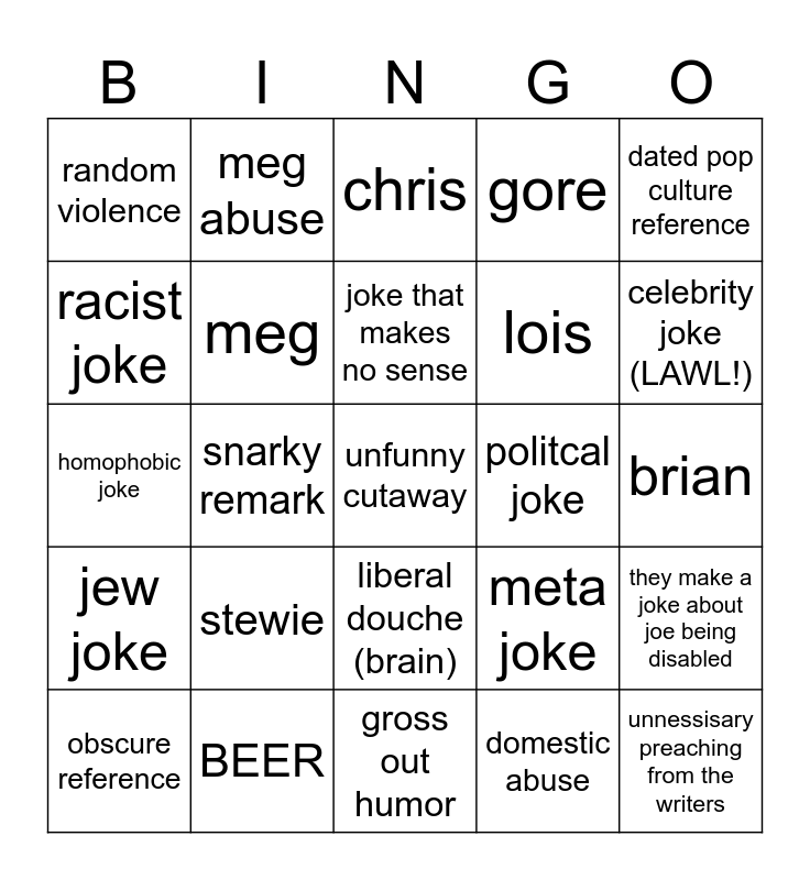 This bingo card has a free space and 24 words: stewie, BEER, joke that makes no sense, obscure reference, dated pop culture reference, random violence, racist joke, meg abuse, politcal joke, liberal douche (brain), lois, homophobic joke, meta joke, they make a joke about joe being disabled, meg, domestic abuse, brian, chris, celebrity joke (LAWL!), snarky remark, unnessisary preaching from the writers, jew joke, gore and gross out humor.