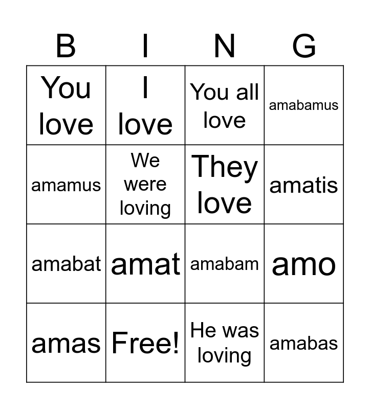 This bingo card has 22 words: Free!, He loves, I love, You were loving, We were loving, They love, You love, You all love, amabam, amabas, amabat, amabamus, amabatis, amabant, He was loving, They were loving, amo, amas, amat, amamus, amatis and amant.