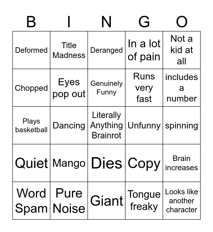 This bingo card has a free space and 24 words: Mango, Pure Noise, Genuinely Funny, Word Spam, Not a kid at all, Deformed, Chopped, Title Madness, Unfunny, Dies, Runs very fast, Plays basketball, Copy, Brain increases, Eyes pop out, Tongue freaky, spinning, Deranged, includes a number, Dancing, Looks like another character, Quiet, In a lot of pain and Giant.