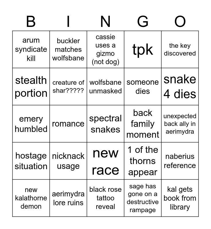 This bingo card has a free space and 24 words: nicknack usage, aerimydra lore ruins, wolfsbane unmasked, new kalathorne demon, the key discovered, arum syndicate kill, stealth portion, buckler matches wolfsbane, back family moment, new race, someone dies, emery humbled, 1 of the thorns appear, naberius reference, creature of shar?????, sage has gone on a destructive rampage, unexpected back ally in aerimydra, cassie uses a gizmo (not dog), snake 4 dies, romance, kal gets book from library, hostage situation, tpk and black rose tattoo reveal.