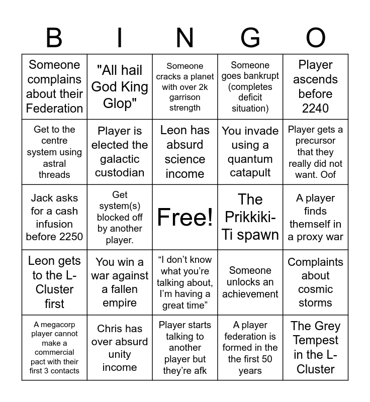 This bingo card has a free space and 24 words: You win a war against a fallen empire, Chris has over absurd unity income, Leon has absurd science income, A megacorp player cannot make a commercial pact with their first 3 contacts, Player ascends before 2240, Someone complains about their Federation, Get to the centre system using astral threads, "All hail God King Glop", The Prikkiki-Ti spawn, “I don’t know what you’re talking about, I’m having a great time”, You invade using a quantum catapult, Jack asks for a cash infusion before 2250, Someone unlocks an achievement, Complaints about cosmic storms, Player is elected the galactic custodian, A player federation is formed in the the first 50 years, A player finds themself in a proxy war, Someone cracks a planet with over 2k garrison strength, Player gets a precursor that they really did not want. Oof, Get system(s) blocked off by another player., The Grey Tempest in the L-Cluster, Leon gets to the L-Cluster first, Someone goes bankrupt (completes deficit situation) and Player starts talking to another player but they’re afk.