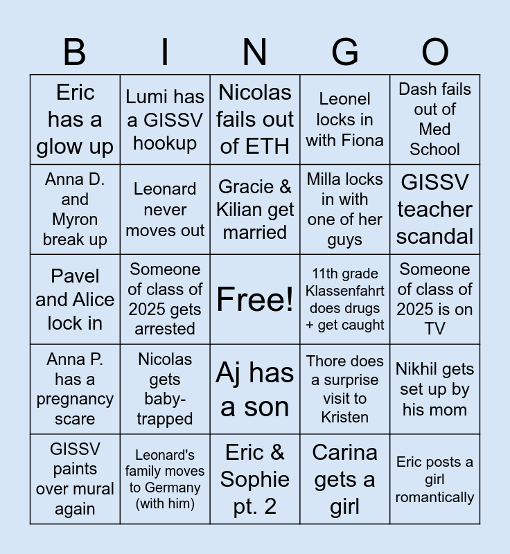 This bingo card has a free space and 24 words: Nicolas gets baby-trapped, Leonard's family moves to Germany (with him), Gracie & Kilian get married, GISSV paints over mural again, Dash fails out of Med School, Eric has a glow up, Anna D. and Myron break up, Lumi has a GISSV hookup, 11th grade Klassenfahrt does drugs + get caught, Aj has a son, Milla locks in with one of her guys, Pavel and Alice lock in, Thore does a surprise visit to Kristen, Nikhil gets set up by his mom, Leonard never moves out, Carina gets a girl, Someone of class of 2025 is on TV, Nicolas fails out of ETH, GISSV teacher scandal, Someone of class of 2025 gets arrested, Eric posts a girl romantically, Anna P. has a pregnancy scare, Leonel locks in with Fiona and Eric & Sophie pt. 2.