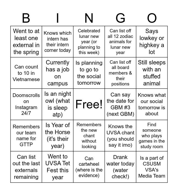 This bingo card has a free space and 24 words: Is Year of the Horse (it's their year), Went to UVSA Tet Fest this year, Is planning to go to the social tomorrow, Can list out the last externals remaining, Says lowkey or highkey a lot, Went to at least one external in the spring, Can count to 10 in Vietnamese, Knows which intern has their intern corner today, Can say the date for GBM #3 (next GBM), Remembers the new chant without looking, Can list off all board members & their positions, Doomscrolls on Instagram 24/7, Knows the UVSA chant (you should say it imo), Find someone who plays games in the study room, Currently has a job on campus, Drank water today (water check!), Knows what our social tomorrow is about, Celebrated lunar new year (or planning to this week), Still sleeps with an stuffed animal, Is an night owl (what is sleep atp), Is a part of CSUSM VSA's Media Team, Remembers our team name for GTTP, Can list off all 12 zodiac animals for lunar new year and Can cartwheel (where is the evidence).