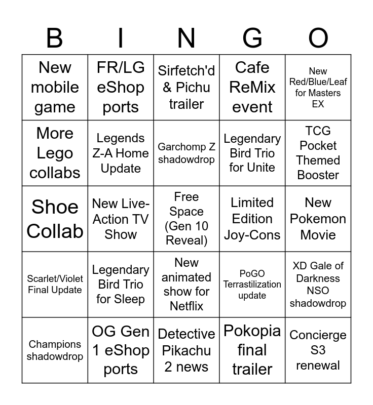 This bingo card has a free space and 24 words: Legendary Bird Trio for Sleep, OG Gen 1 eShop ports, Garchomp Z shadowdrop, Champions shadowdrop, New Red/Blue/Leaf for Masters EX, New mobile game, More Lego collabs, FR/LG eShop ports, Limited Edition Joy-Cons, New animated show for Netflix, Legendary Bird Trio for Unite, Shoe Collab, PoGO Terrastilization update, XD Gale of Darkness NSO shadowdrop, Legends Z-A Home Update, Pokopia final trailer, New Pokemon Movie, Sirfetch'd & Pichu trailer, TCG Pocket Themed Booster, New Live-Action TV Show, Concierge S3 renewal, Scarlet/Violet Final Update, Cafe ReMix event and Detective Pikachu 2 news.