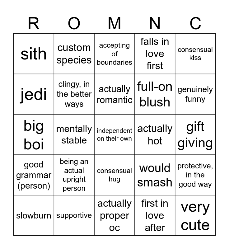 This bingo card has 25 words: being an actual upright person, actually proper oc, actually romantic, slowburn, consensual kiss, sith, jedi, custom species, actually hot, consensual hug, full-on blush, big boi, would smash, protective, in the good way, clingy, in the better ways, very cute, gift giving, accepting of boundaries, genuinely funny, mentally stable, independent on their own, supportive, good grammar (person), falls in love first and first in love after.