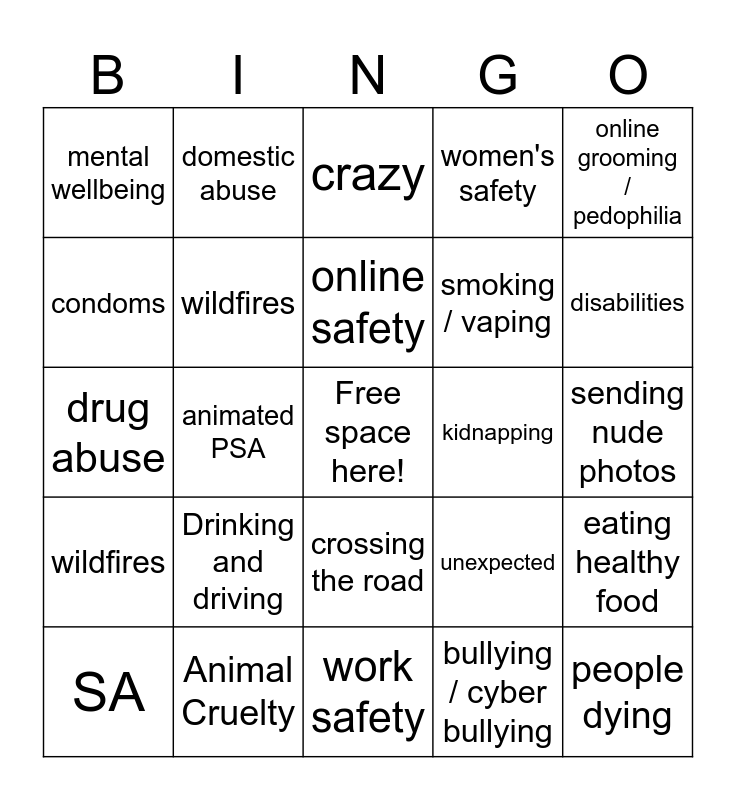 This bingo card has a free space and 24 words: Drinking and driving, Animal Cruelty, online safety, SA, online grooming / pedophilia, mental wellbeing, condoms, domestic abuse, kidnapping, crossing the road, smoking / vaping, drug abuse, unexpected, eating healthy food, wildfires, bullying / cyber bullying, sending nude photos, crazy, disabilities, animated PSA, people dying, wildfires, women's safety and work safety.