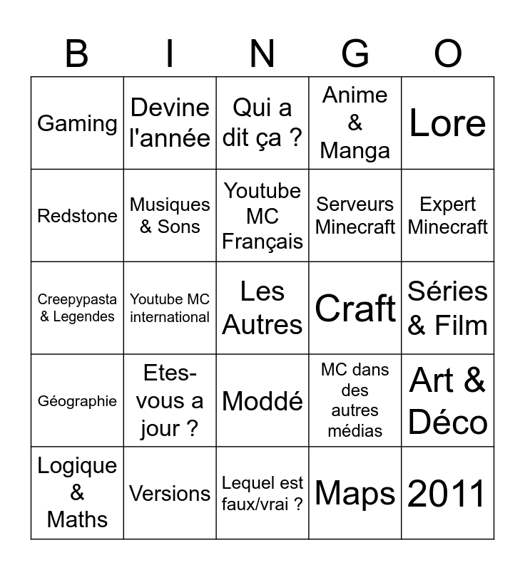 This bingo card has 25 words: Etes-vous a jour ?, Lequel est faux/vrai ?, Youtube MC Français, Logique & Maths, Lore, Gaming, Redstone, Devine l'année, Craft, Moddé, Serveurs Minecraft, Creepypasta & Legendes, MC dans des autres médias, Art & Déco, Musiques & Sons, 2011, Séries & Film, Qui a dit ça ?, Expert Minecraft, Youtube MC international, Les Autres, Versions, Géographie, Anime & Manga and Maps.