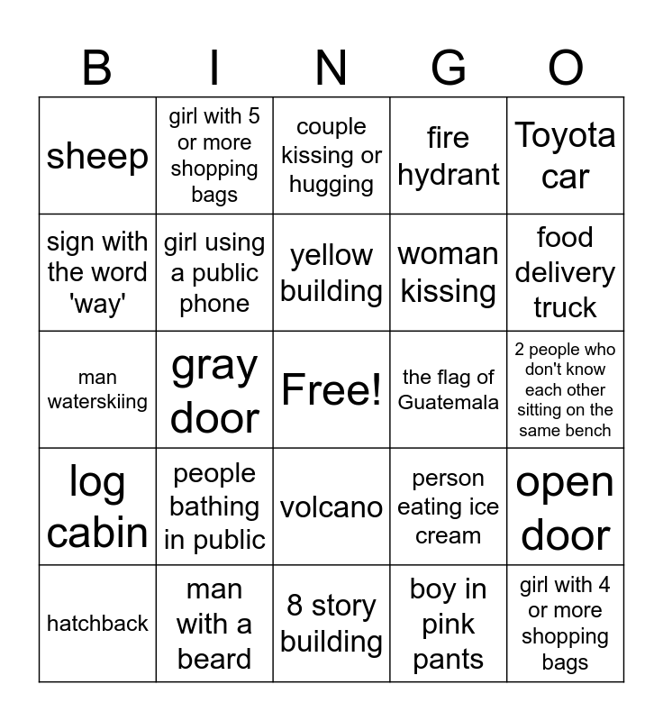 This bingo card has a free space and 25 words: people bathing in public, 8 story building, yellow building, hatchback, Toyota car, sheep, sign with the word 'way', girl with 5 or more shopping bags, the flag of Guatemala, volcano, woman kissing, man waterskiing, person eating ice cream, open door, girl using a public phone, businesswoman on a cellphone, 2 people who don't know each other sitting on the same bench, couple kissing or hugging, food delivery truck, gray door, girl with 4 or more shopping bags, man with a beard, log cabin, fire hydrant and boy in pink pants.