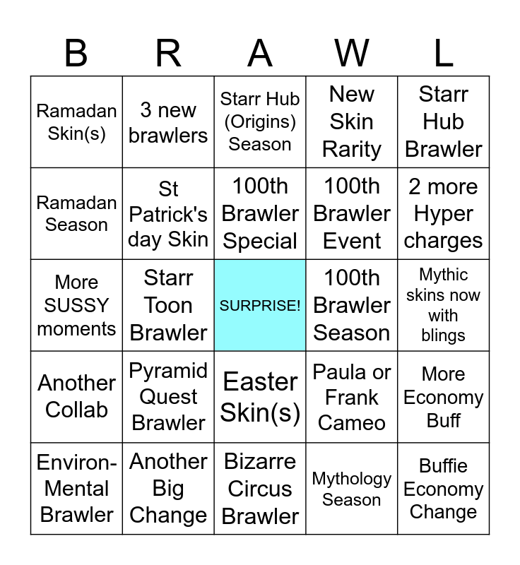 This bingo card has a free space and 24 words: Pyramid Quest Brawler, Another Big Change, 100th Brawler Special, Environ- Mental Brawler, Starr Hub Brawler, Ramadan Skin(s), Ramadan Season, 3 new brawlers, 100th Brawler Season, Easter Skin(s), 100th Brawler Event, More SUSSY moments, Paula or Frank Cameo, More Economy Buff, St Patrick's day Skin, Mythology Season, Mythic skins now with blings, Starr Hub (Origins) Season, 2 more Hyper charges, Starr Toon Brawler, Buffie Economy Change, Another Collab, New Skin Rarity and Bizarre Circus Brawler.