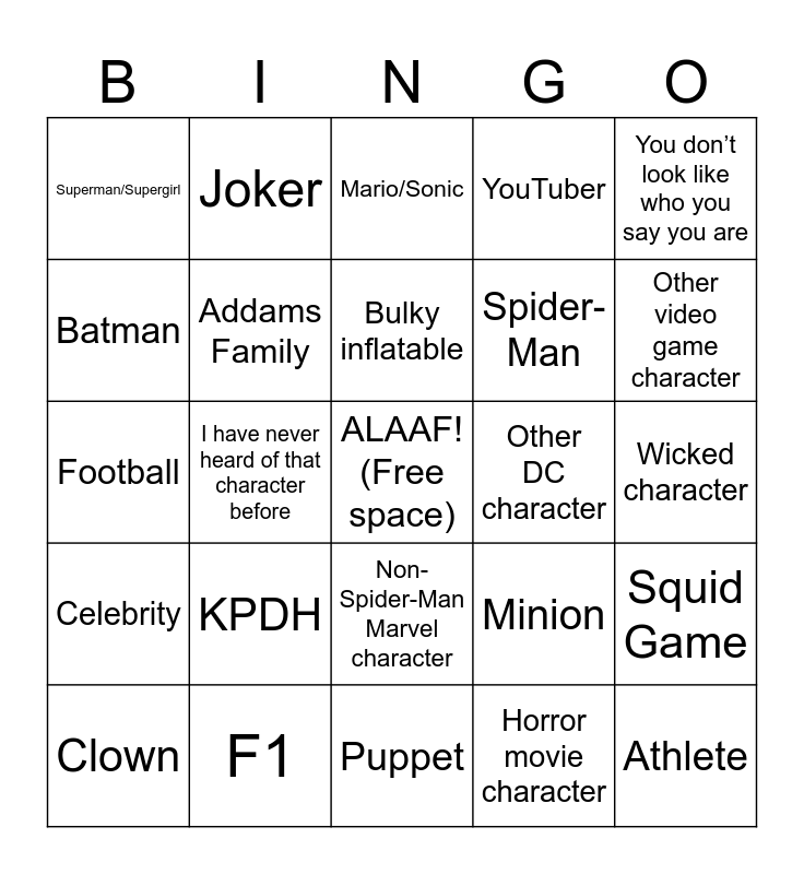 This bingo card has a free space and 24 words: KPDH, F1, Bulky inflatable, Clown, You don’t look like who you say you are, Superman/Supergirl, Batman, Joker, Other DC character, Non-Spider-Man Marvel character, Spider-Man, Football, Minion, Squid Game, Addams Family, Horror movie character, Wicked character, Mario/Sonic, Other video game character, I have never heard of that character before, Athlete, Celebrity, YouTuber and Puppet.