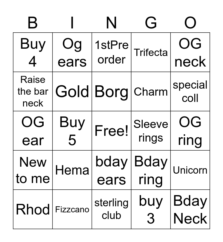 This bingo card has a free space and 24 words: Rhod, Hema, Borg, buy 3, OG neck, Buy 4, Og ears, 1stPre order, Sleeve rings, OG ring, OG ear, Gold, Bday ring, Unicorn, Raise the bar neck, Fizzcano, sterling club, Trifecta, special coll, New to me, Buy 5, bday ears, Charm and Bday Neck.