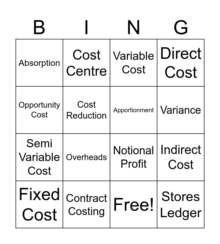 This bingo card has 17 words: Free!, Fixed Cost, Variable Cost, Absorption, Overheads, Direct Cost, Indirect Cost, Apportionment, Variance, Cost Reduction, Contract Costing, Notional Profit, Opportunity Cost, Cost Centre, Semi Variable Cost, Allocation and Stores Ledger.