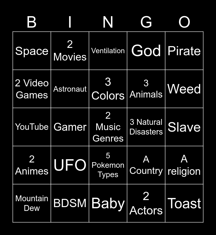 This bingo card has a free space and 24 words: UFO, BDSM, 3 Colors, Mountain Dew, Pirate, Space, 2 Video Games, 2 Movies, 3 Natural Disasters, 5 Pokemon Types, 3 Animals, YouTube, A Country, A religion, Astronaut, 2 Actors, Slave, Ventilation, Weed, Gamer, Toast, 2 Animes, God and Baby.