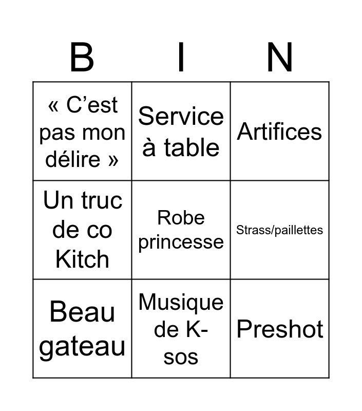 This bingo card has a free space and 8 words: Strass/paillettes, Artifices, Service à table, Beau gateau, « C’est pas mon délire », Preshot, Un truc de co Kitch and Musique de K-sos.