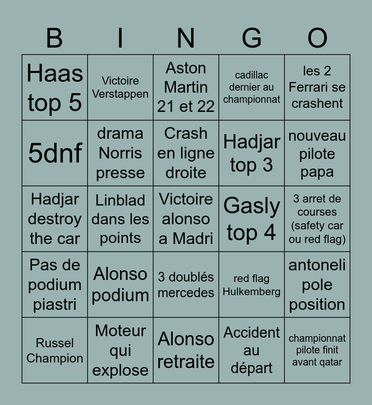 This bingo card has a free space and 24 words: Alonso podium, Moteur qui explose, Crash en ligne droite, Russel Champion, les 2 Ferrari se crashent, Haas top 5, 5dnf, Victoire Verstappen, Gasly top 4, 3 doublés mercedes, Hadjar top 3, Hadjar destroy the car, red flag Hulkemberg, antoneli pole position, drama Norris presse, Accident au départ, 3 arret de courses (safety car ou red flag), Aston Martin 21 et 22, nouveau pilote papa, Linblad dans les points, championnat pilote finit avant qatar, Pas de podium piastri, cadillac dernier au championnat and Alonso retraite.