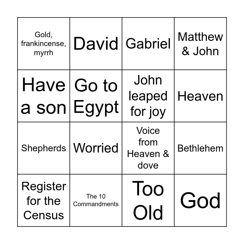 This bingo card has 16 words: The 10 Commandments, Bethlehem, Gabriel, Gold, frankincense, myrrh, Shepherds, David, Voice from Heaven & dove, Too Old, Have a son, Go to Egypt, Register for the Census, Matthew & John, Worried, Heaven, John leaped for joy and God.