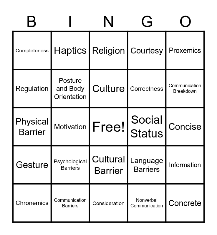 This bingo card has a free space and 34 words: Verbal Communication, Nonverbal Communication, Paralanguage, Facial Expressions, Gesture, Posture and Body Orientation, Proxemics, Chronemics, Haptics, Intercultural Communication, Culture, Religion, Age, Gender, Social Status, Communication Breakdown, Communication Barriers, Physical Barrier, Psychological Barriers, Language Barriers, Cultural Barrier, Technological Barrier, Completeness, Concise, Consideration, Concrete, Courtesy, Clarity, Correctness, Regulation, Social Interaction, Motivation, Information and Emotional Expression.