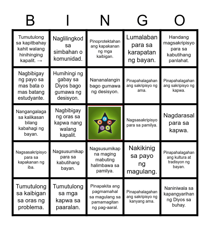 This bingo card has a free space and 24 words: Tumutulong sa kaibigan sa oras ng problema., Nagsusumikap para sa kabutihang bayan., Nananalangin bago gumawa ng desisyon., Pinapahalagahan ang sakripisyo ng kanyang ama., Handang magsakripisyo para sa kabutihang panlahat., Tumutulong sa kapitbahay kahit walang hinihinging kapalit. →, Naglilingkod sa simbahan o komunidad., Pinoprotektahan ang kapakanan ng mga kaibigan., Nagsasakripisyo para sa pamilya., Nagdarasal para sa kapwa., Nangangalaga sa kalikasan bilang kabahagi ng bayan., Humihingi ng gabay sa Diyos bago gumawa ng desisyon., Nakikinig sa payo ng magulang., Pinapahalagahan ang kultura at tradisyon ng bayan., Nagbibigay ng payo sa mas bata o mas batang estudyante., Tumutulong sa mga kapwa sa paaralan., Pinapakita ang pagmamahal sa magulang sa pamamagitan ng pag-aaral., Lumalaban para sa karapatan ng bayan., Pinapahalagahan ang sakripisyo ng kapwa., Nagsasakripisyo para sa kapakanan ng iba., Nagbibigay ng oras sa kapwa nang walang kapalit., Nagsusumikap na maging mabuting halimbawa sa pamilya., Pinapahalagahan ang sakripisyo ng ama. and Naniniwala sa kapangyarihan ng Diyos sa buhay..