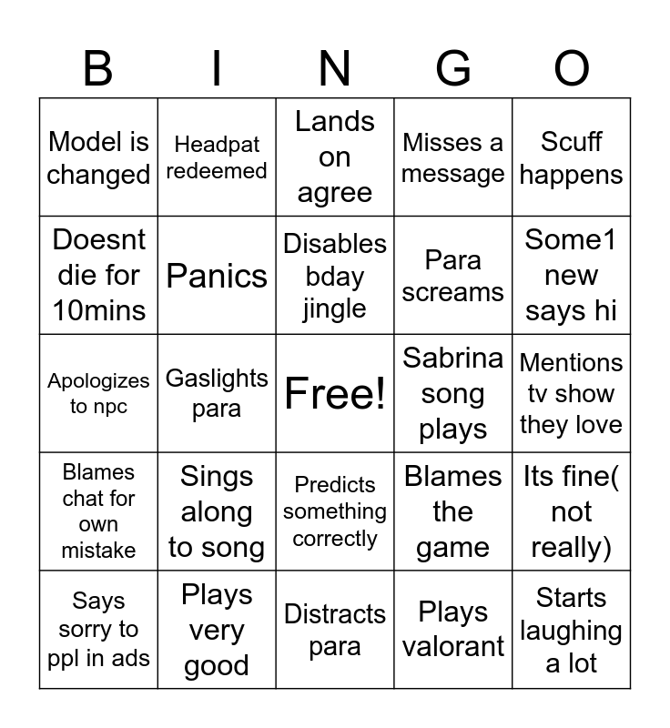 This bingo card has a free space and 24 words: Says sorry to ppl in ads, Sings along to song, Disables bday jingle, Plays valorant, Scuff happens, Model is changed, Headpat redeemed, Lands on agree, Sabrina song plays, Mentions tv show they love, Apologizes to npc, Panics, Blames the game, Its fine( not really), Doesnt die for 10mins, Plays very good, Distracts para, Misses a message, Some1 new says hi, Blames chat for own mistake, Gaslights para, Predicts something correctly, Para screams and Starts laughing a lot.