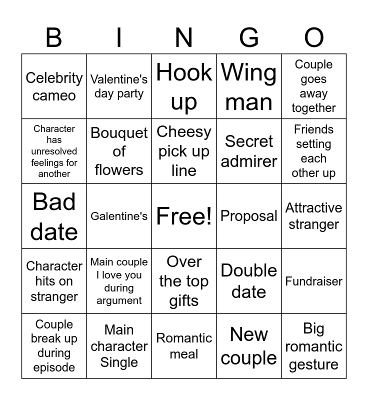 This bingo card has a free space and 24 words: Main couple I love you during argument, Main character Single, Cheesy pick up line, Couple break up during episode, Couple goes away together, Celebrity cameo, Character has unresolved feelings for another, Valentine's day party, Proposal, Over the top gifts, Secret admirer, Bad date, Double date, Fundraiser, Bouquet of flowers, New couple, Attractive stranger, Hook up, Friends setting each other up, Galentine's, Big romantic gesture, Character hits on stranger, Wing man and Romantic meal.