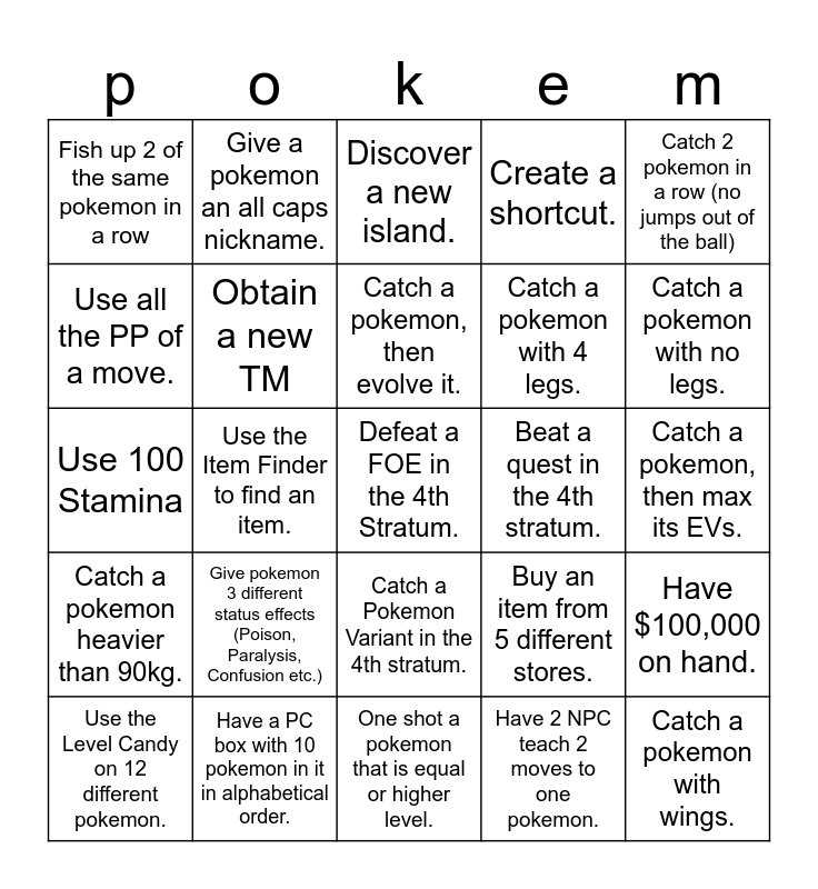 This bingo card has 35 words: Wonder trade 2 pokemon., Gain 10 total levels, Sail anywhere on the sea, then sail back to where you started without sinking., Obtain a new TM, Catch a Pokemon Variant in the 4th stratum., Create a shortcut., Use all the PP of a move., White out, Catch a pokemon, then evolve it., Beat a trainer at the Battle House., Use 100 Stamina, Catch 2 pokemon in a row (no jumps out of the ball), Win the lottery, Rename a pokemon "Gooberino", Fish up 2 of the same pokemon in a row, Beat a quest in the 4th stratum., Have 2 NPC teach 2 moves to one pokemon., Use the Item Finder to find an item., Catch a pokemon heavier than 90kg., Defeat a FOE in the 4th Stratum., Buy an item from 5 different stores., Use the Level Candy on 12 different pokemon., Have $100,000 on hand., Have a PC box with 10 pokemon in it in alphabetical order., Discover a new island., Catch a pokemon with no legs., Catch a pokemon with wings., Catch a pokemon with fins., Catch a pokemon with 4 legs., Catch a pokemon, then max its EVs., Get a pokemon as a quest reward., One shot a pokemon that is equal or higher level., Give pokemon 3 different status effects (Poison, Paralysis, Confusion etc.), Give a pokemon an all caps nickname. and Have a pokemon learn a move that only exists in this game by leveling up..