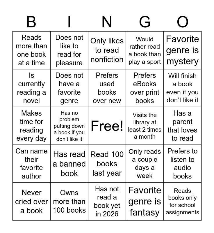 This bingo card has a free space and 24 words: Has read a banned book, Owns more than 100 books, Prefers used books over new, Never cried over a book, Favorite genre is mystery, Reads more than one book at a time, Is currently reading a novel, Does not like to read for pleasure, Visits the library at least 2 times a month, Read 100 books last year, Prefers eBooks over print books, Makes time for reading every day, Only reads a couple days a week, Prefers to listen to audio books, Does not have a favorite genre, Favorite genre is fantasy, Has a parent that loves to read, Only likes to read nonfiction, Will finish a book even if you don’t like it, Has no problem putting down a book if you don’t like it, Reads books only for school assignments, Can name their favorite author, Would rather read a book than play a sport and Has not read a book yet in 2026.