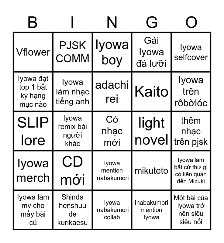 This bingo card has a free space and 24 words: CD mới, Shinda henshuu de kurikaesu, adachi rei, Iyowa làm mv cho mấy bài cũ, Iyowa selfcover, Vflower, Iyowa đạt top 1 bất kỳ hạng mục nào, PJSK COMM, light novel, Iyowa mention Inabakumori, Kaito, SLIP lore, mikuteto, Iyowa làm bất cứ thứ gì có liên quan đến Mizuki, Iyowa làm nhạc tiếng anh, Inabakumori mention Iyowa, thêm nhạc trên pjsk, Iyowa boy, Iyowa trên rôbờlóc, Iyowa remix bài người khác, Một bài của Iyowa trở nên siêu siêu nổi, Iyowa merch, Gái Iyowa đá lưỡi and Iyowa Inabakumori collab.