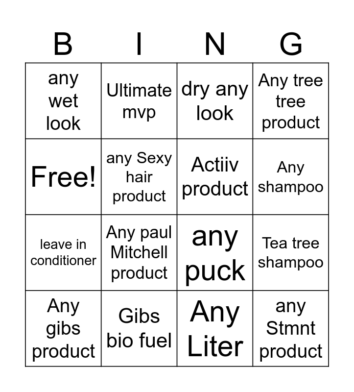This bingo card has 16 words: Gibs bio fuel, Tea tree shampoo, dry any look, any wet look, leave in conditioner, Ultimate mvp, any puck, Any Liter, Free!, any Sexy hair product, Any gibs product, Any tree tree product, Any paul Mitchell product, Any shampoo, Actiiv product and any Stmnt product.