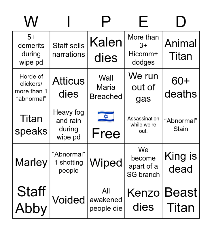 This bingo card has a free space and 24 words: Staff Abby, “Abnormal” 1 shotting people, Wall Maria Breached, Kenzo dies, Animal Titan, 5+ demerits during wipe pd, Staff sells narrations, Kalen dies, Assassination while we’re out., “Abnormal” Slain, Titan speaks, Atticus dies, We become apart of a SG branch, King is dead, Horde of clickers/ more than 1 “abnormal”, Voided, All awakened people die, More than 3+ Hicomm+ dodges, 60+ deaths, Marley, Heavy fog and rain during wipe pd, Wiped, We run out of gas and Beast Titan.