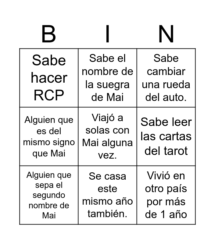 This bingo card has 32 words: Free!, Fue al colegio con Mai (primaria o secundaria)., Es pariente de Mai, Conoce al novio desde antes que a Mai, Estuvo en el momento en que se conocieron Mai y Martin, Alguien que sepa el segundo nombre de Mai, Viajó a solas con Mai alguna vez., Conoce a la Mai hace más de 10 años., Sabe el nombre de la suegra de Mai, Está casada., Se casa este mismo año también., Sabe cambiar una rueda del auto., Es zurda., Nació en el mismo mes que vos., Tiene una mascota que no sea perro ni gato., Sabe hacer la vertical, Toca un instrumento musical., Cumple años el mismo día que algún famoso (y sabe decirte quién)., Tiene el mismo talle de zapatos que Mai., Lloró cuando se enteró del casamiento, Trabajó o trabaja actualmente con Mai, Se fue de viaje de egresados con Mai, Fue a más de 5 casamientos en el 2025, Se ganó un sorteo de Instagram o, Alguna vez salió en la televisión, Alguien que es del mismo signo que Mai, Vivió en otro país por más de 1 año, Sabe leer las cartas del tarot, Sabe hacer RCP, Corrió una maratón o media maratón, Un video suyo se hizo viral en TikTok and Nunca en su vida se subió a una montaña rusa..