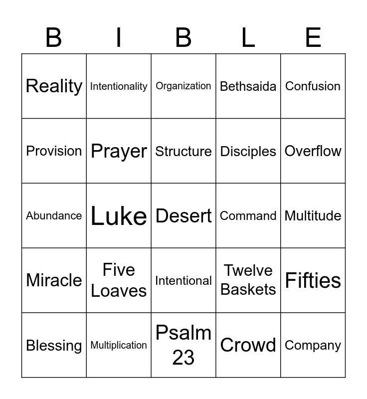This bingo card has 40 words: Order, Abundance, Obedience, Prayer, Multiplication, Intentional, Structure, Discipline, Confusion, Miracle, Luke, Bethsaida, Desert, Multitude, Command, Five Loaves, Two Fish, Reality, Five Thousand, Organization, Fifties, Crowd, Disciples, Provision, Lad, Andrew, Faith, Sit Down, Company, Late, Feed, Blessing, Fragments, Twelve Baskets, Overflow, Psalm 23, Author, Gospel, Intentionality and Praise.