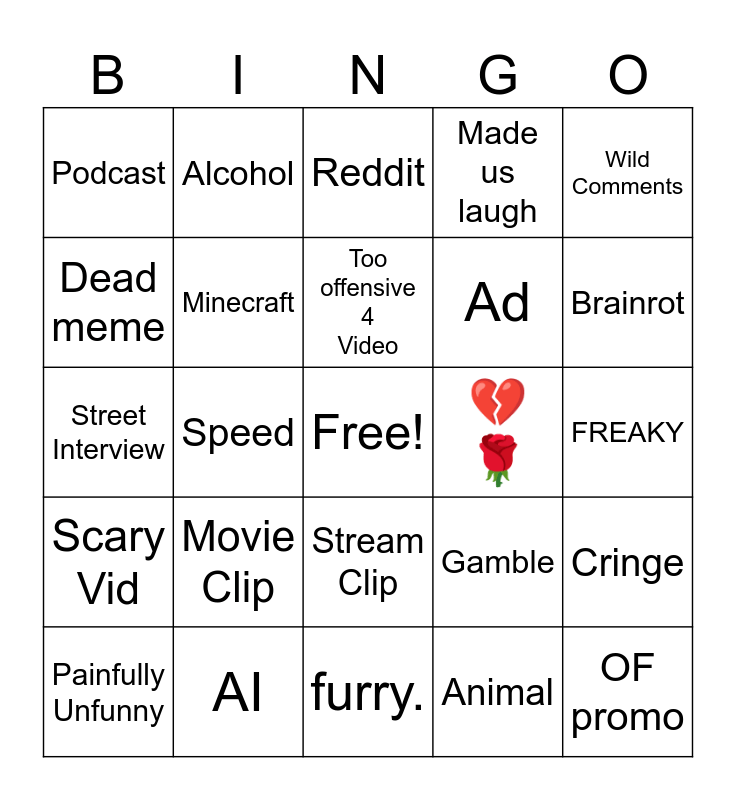 This bingo card has a free space and 24 words: Movie Clip, AI, Too offensive 4 Video, Painfully Unfunny, Wild Comments, Podcast, Dead meme, Alcohol, 💔🌹, Stream Clip, Ad, Street Interview, Gamble, Cringe, Minecraft, Animal, FREAKY, Reddit, Brainrot, Speed, OF promo, Scary Vid, Made us laugh and furry..