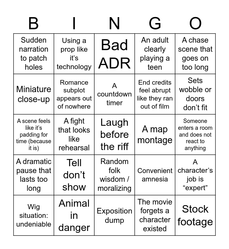This bingo card has a free space and 51 words: Obvious day-for-night filming, Stock footage, Wildly inconsistent accents from same character, Exposition dump, Tell don’t show, “Science” is basically vibes, Using a prop like it’s technology, Creature that is clearly a guy in a suit, Miniature close-up, A big dramatic speech, Romance subplot appears out of nowhere, An adult clearly playing a teen, A character’s job is “expert”, Convenient amnesia, Sudden flashback, Villain monologue, A countdown timer, A map montage, Military guys who all look the same, A chase scene that goes on too long, A fight that looks like rehearsal, The movie forgets a character existed, Sudden narration to patch holes, End credits feel abrupt like they ran out of film, Finale is extras yelling, Boom mic / shadow / crew reflection, Sets wobble or doors don’t fit, Costume looks like a thrift-store Halloween rack, Wig situation: undeniable, Bad ADR, Music is WAY too loud for the scene, One sound effect reused repeatedly, Overacting that belongs in a different movie, Underacting like they’re reading a grocery list, Props: obviously cardboard / spray paint, Animal in danger, Same set design used for multiple locations, Dated reference, A character has a hilariously specific name, Make the same joke before the riff, Someone enters a room and does not react to anything, A dramatic pause that lasts too long, Uncomfortable lingering close-up, A character makes a decision that makes no human sense, A clearly fake laugh, A reaction shot that doesn’t match the dialogue, A scene feels like it’s padding for time (because it is), A character repeats information we just heard, An “emotional moment” with zero chemistry, Random folk wisdom / moralizing and Someone says “no time!” while wasting time.