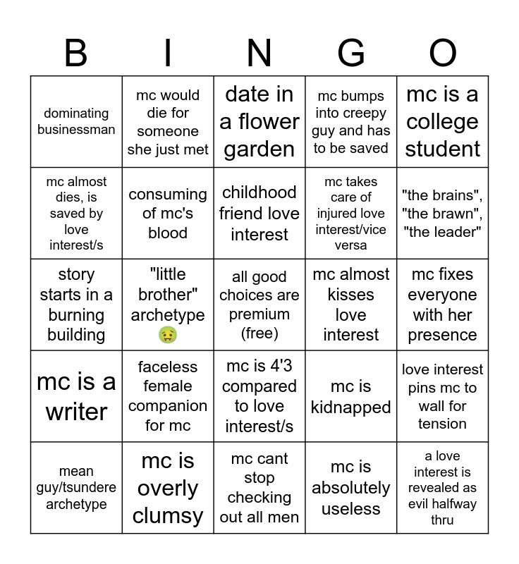 This bingo card has a free space and 29 words: mean guy/tsundere archetype, plot twist: love interest/s have supernatural powers, "little brother" archetypeš¤¢, nickname i.e. "little dove" "kitten" "pet", dominating businessman, date in a flower garden, consuming of mc's blood, faceless female companion for mc, mc almost kisses love interest, mc is overly clumsy, mc fixes everyone with her presence, a love interest is revealed as evil halfway thru, mc cant stop checking out all men, mc is absolutely useless, "the brains", "the brawn", "the leader", orphan, mc is 4'3 compared to love interest/s, mc is a writer, mc is a college student, story starts in a burning building, mc is kidnapped, mc is revealed to be anything besides a normal human, mc takes care of injured love interest/vice versa, mc almost dies, is saved by love interest/s, mc bumps into creepy guy and has to be saved, mc would die for someone she just met, love interest pins mc to wall for tension, childhood friend love interest and amnesia.