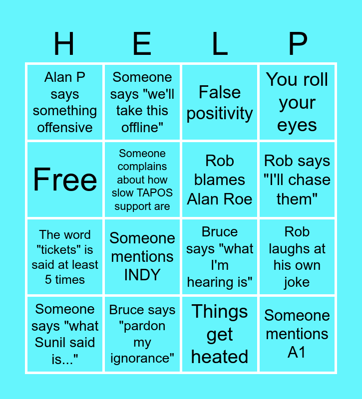 This bingo card has 16 words: Bruce says "pardon my ignorance", Rob laughs at his own joke, False positivity, Alan P says something offensive, The word "tickets" is said at least 5 times, Someone says "we'll take this offline", Bruce says "what I'm hearing is", Things get heated, Free, Someone complains about how slow TAPOS support are, Someone says "what Sunil said is...", You roll your eyes, Someone mentions INDY, Rob says "I'll chase them", Rob blames Alan Roe and Someone mentions A1.