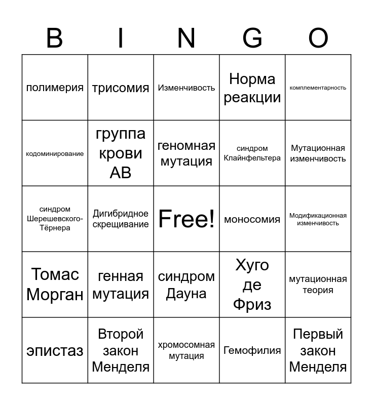 This bingo card has a free space and 24 words: генная мутация, Второй закон Менделя, геномная мутация, эпистаз, комплементарность, полимерия, кодоминирование, трисомия, моносомия, синдром Дауна, синдром Клайнфельтера, синдром Шерешевского-Тёрнера, Хуго де Фриз, мутационная теория, группа крови AB, Гемофилия, Модификационная изменчивость, Изменчивость, Мутационная изменчивость, Дигибридное скрещивание, Первый закон Менделя, Томас Морган, Норма реакции and хромосомная мутация.