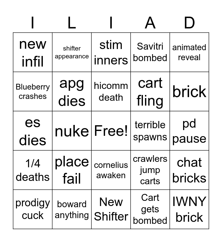 This bingo card has a free space and 24 words: prodigy cuck, place fail, hicomm death, Cart gets bombed, animated reveal, new infil, shifter appearance, stim inners, terrible spawns, pd pause, es dies, apg dies, crawlers jump carts, chat bricks, Blueberry crashes, boward anything, New Shifter, Savitri bombed, brick, 1/4 deaths, nuke, cornelius awaken, cart fling and IWNY brick.