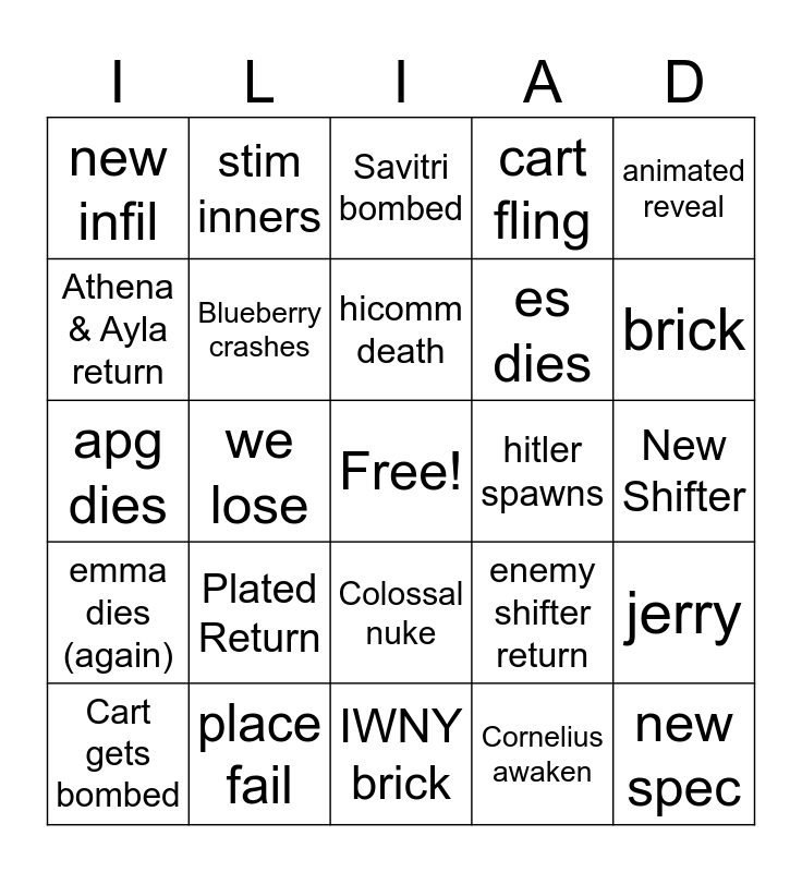 This bingo card has a free space and 24 words: Plated Return, place fail, hicomm death, Cart gets bombed, animated reveal, new infil, Athena & Ayla return, stim inners, hitler spawns, Colossal nuke, es dies, apg dies, enemy shifter return, jerry, Blueberry crashes, Cornelius awaken, New Shifter, Savitri bombed, brick, we lose, new spec, emma dies (again), cart fling and IWNY brick.