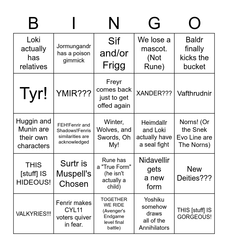 This bingo card has a free space and 24 words: Surtr is Muspell's Chosen, Fenrir makes CYL11 voters quiver in fear., Freyr comes back just to get offed again, VALKYRIES!!!, Baldr finally kicks the bucket, Loki actually has relatives, Tyr!, Jormungandr has a poison gimmick, Heimdallr and Loki actually have a seal fight, Rune has a "True Form" (he isn't actually a child), XANDER???, Huggin and Munin are their own characters, Nidavellir gets a new form, New Deities???, YMIR???, Yoshiku somehow draws all of the Annihilators, Norns! (Or the Snek Evo Line are The Norns), Sif and/or Frigg, Vafthrudnir, FEH!Fenrir and Shadows!Fenris similarities are acknowledged, THIS [stuff] IS GORGEOUS!, THIS [stuff] IS HIDEOUS!, We lose a mascot. (Not Rune) and TOGETHER WE RIDE (Avenger's Endgame level final battle).