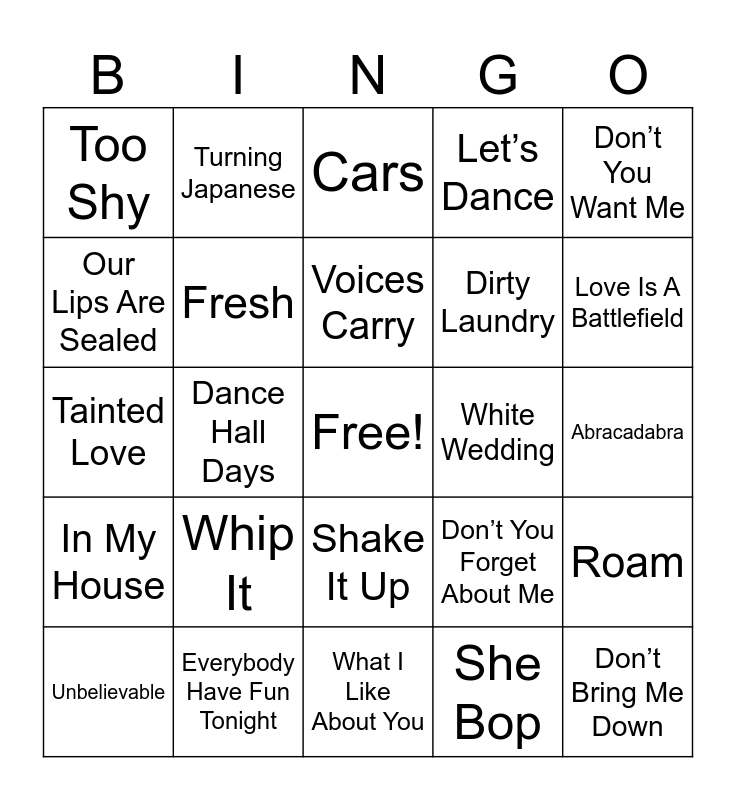 This bingo card has a free space and 36 words: I Melt with You, People Are People, Any Way You Want It, Fresh, Don’t You Forget About Me, In My House, Voices Carry, Shout, Don’t You Want Me, She Drives Me Crazy, Dance Hall Days, Let’s Dance, Sussudio, White Wedding, Love Is A Battlefield, Too Shy, Obsession, Whip It, Don’t Bring Me Down, Cars, Abracadabra, Roam, Everybody Have Fun Tonight, Unbelievable, What I Like About You, Turning Japanese, Tainted Love, I Touch Myself, Dirty Laundry, Our Lips Are Sealed, Hip To Be Square, Goody Two Shoes, She Bop, Shake It Up, Everybody Wants To Rule The World and Burning Down The House.