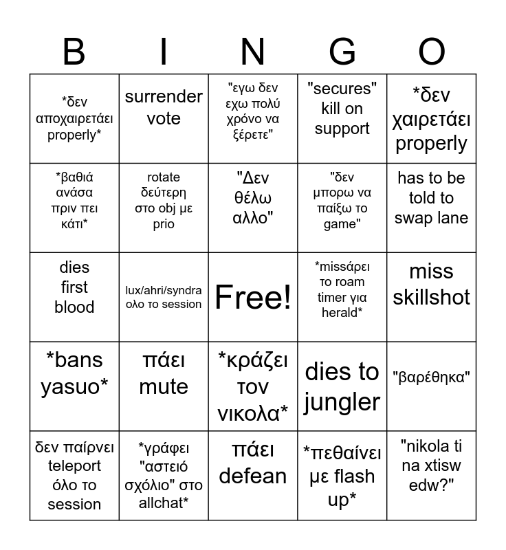 This bingo card has a free space and 24 words: πάει mute, *γράφει "αστειό σχόλιο" στο allchat*, "Δεν θέλω αλλο", δεν παίρνει teleport όλο το session, *δεν χαιρετάει properly, *δεν αποχαιρετάει properly*, *βαθιά ανάσα πριν πει κάτι*, surrender vote, *missάρει το roam timer για herald*, *κράζει τον νικολα*, "δεν μπορω να παίξω το game", dies first blood, dies to jungler, "βαρέθηκα", rotate δεύτερη στο obj με prio, *πεθαίνει με flash up*, miss skillshot, "εγω δεν εχω πολύ χρόνο να ξέρετε", has to be told to swap lane, lux/ahri/syndra ολο το session, "nikola ti na xtisw edw?", *bans yasuo*, "secures" kill on support and πάει defean.