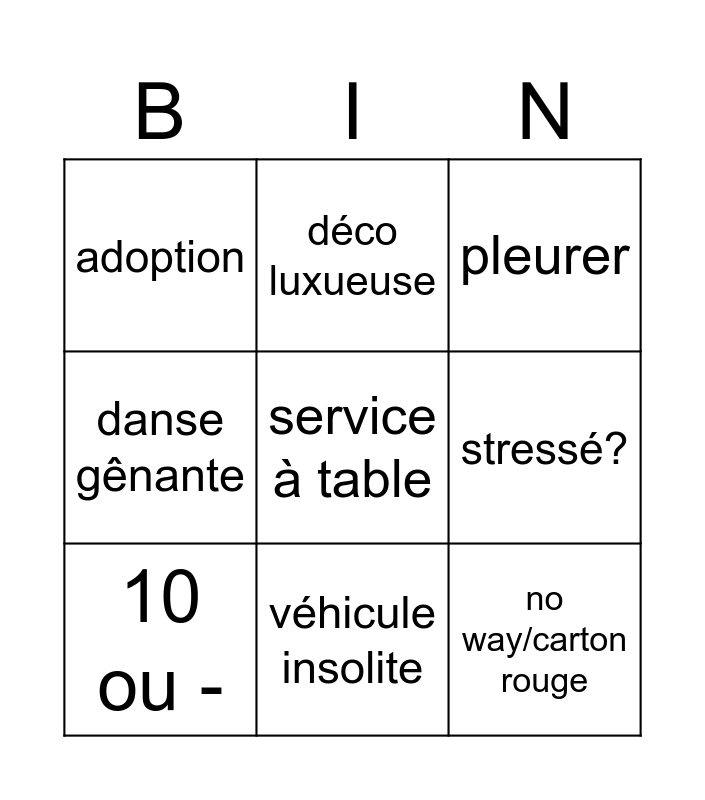 This bingo card has a free space and 8 words: stressé?, pleurer, déco luxueuse, 10 ou -, adoption, no way/carton rouge, danse gênante and véhicule insolite.