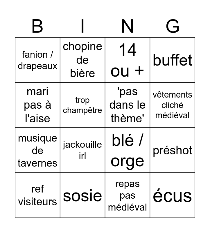 This bingo card has 16 words: sosie, préshot, 14 ou +, fanion / drapeaux, musique de tavernes, chopine de bière, blé / orge, repas pas médiéval, mari pas à l'aise, trop champêtre, ref visiteurs, buffet, jackouille irl, vêtements cliché médiéval, 'pas dans le thème' and écus.
