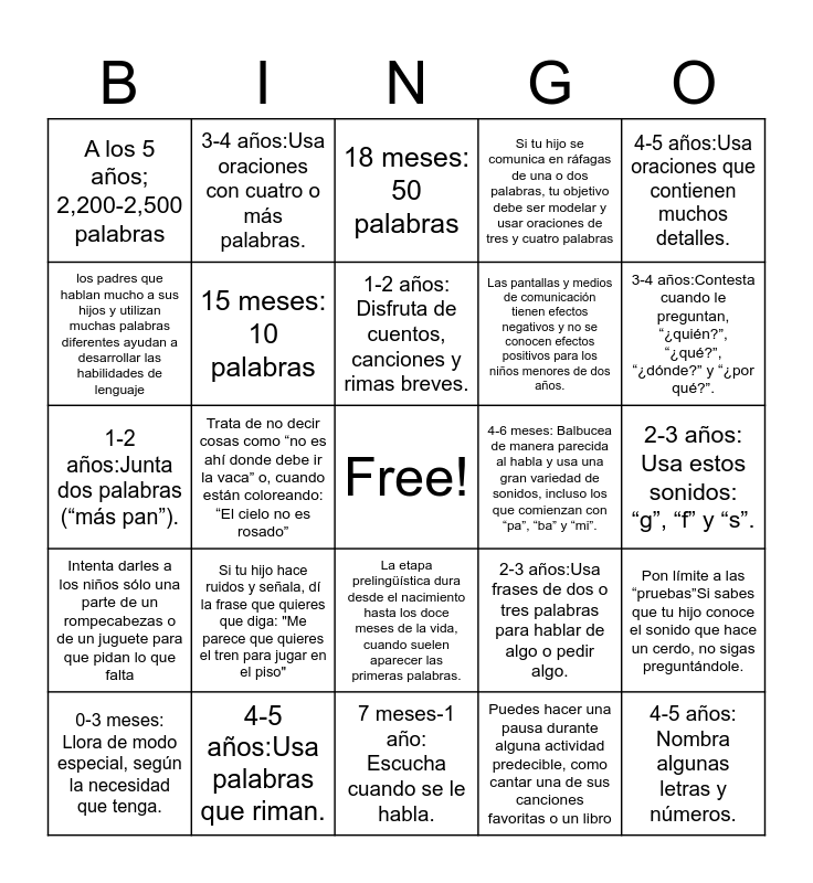 This bingo card has a free space and 34 words: 0-3 meses:Balbucea, murmura o emite sonidos agradables., Puedes hacer una pausa durante alguna actividad predecible, como cantar una de sus canciones favoritas o un libro, 4-5 años:Usa oraciones que contienen muchos detalles., Puedes repetir una palabra en diferentes frases para que el niño se acostumbre a escucharla en distintos contextos., Intenta darles a los niños sólo una parte de un rompecabezas o de un juguete para que pidan lo que falta, 15 meses: 10 palabras, 4-5 años:Usa oraciones que contienen muchos detalles., 0-3 meses: Llora de modo especial, según la necesidad que tenga., 3-4 años:Usa oraciones con cuatro o más palabras., A los 2 años: 200-300 palabras, 1-2 años: Disfruta de cuentos, canciones y rimas breves., 18 meses: 50 palabras, Es bueno recorrer la casa y observar dónde están los libros y los juguetes para que ellos los pidan, 4-6 meses: Presta atención a la música., 4-6 meses: Balbucea de manera parecida al habla y usa una gran variedad de sonidos, incluso los que comienzan con “pa”, “ba” y “mi”., 3-4 años:Contesta cuando le preguntan, “¿quién?”, “¿qué?”, “¿dónde?” y “¿por qué?”., 4-5 años:Usa palabras que riman., 1-2 años:Junta dos palabras (“más pan”)., Si tu hijo hace ruidos y señala, dí la frase que quieres que diga: "Me parece que quieres el tren para jugar en el piso", 2-3 años:Usa frases de dos o tres palabras para hablar de algo o pedir algo., La etapa prelingüística dura desde el nacimiento hasta los doce meses de la vida, cuando suelen aparecer las primeras palabras., 7 meses-1año: Responde a lo que se le pide (“ven acá”)., A los 5 años; 2,200-2,500 palabras, 2-3 años: Usa estos sonidos: “g”, “f” y “s”., 7 meses-1 año: Escucha cuando se le habla., 4-5 años: Nombra algunas letras y números., Si tu hijo se comunica en ráfagas de una o dos palabras, tu objetivo debe ser modelar y usar oraciones de tres y cuatro palabras, Cuando tu hijo dice “camión rojo”, tú puedes ampliar eso diciendo: “Sí, un camión rojo grande”, Las pantallas y medios de comunicación tienen efectos negativos y no se conocen efectos positivos para los niños menores de dos años., los padres que hablan mucho a sus hijos y utilizan muchas palabras diferentes ayudan a desarrollar las habilidades de lenguaje, Existe evidencia científica que demuestra que cuanto menos tiempo de conversación tiene un niño, más pobre es su desarrollo del lenguaje, Trata de no decir cosas como “no es ahí donde debe ir la vaca” o, cuando están coloreando: “El cielo no es rosado”, Pon límite a las “pruebas”Si sabes que tu hijo conoce el sonido que hace un cerdo, no sigas preguntándole. and Dar elogios mas completos: “Muy bien hecho al colocar todos los bloques en su lugar”.