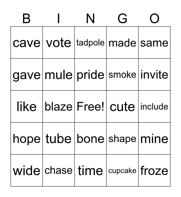 This bingo card has a free space and 31 words: time, dime, blaze, slime, cave, tadpole, mule, shape, cute, cupcake, include, froze, escape, stone, invite, became, mine, tube, hope, bone, same, poke, wide, vote, smoke, gave, made, like, chase, pride and theme.