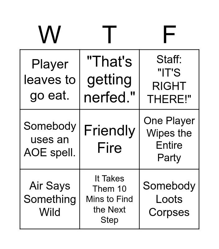 This bingo card has a free space and 12 words: "I Got This", Somebody is unable to join and let us know via Discord., Somebody Loots Corpses, One Player Wipes the Entire Party, "That's getting nerfed.", Staff: "IT'S RIGHT THERE!", It Takes Them 10 Mins to Find the Next Step, Somebody Places Down a Banner, Player leaves to go eat., Somebody uses an AOE spell., Air Says Something Wild and Somebody wants to help the enemy instead..